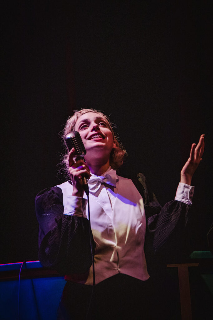 Caroline brings a dynamic energy to the stage, interacting seamlessly with the other performers and enriching the spirit of the club. Her presence also ensures the work is accessible and immersive, creating a shared experience that resonates with all audiences.